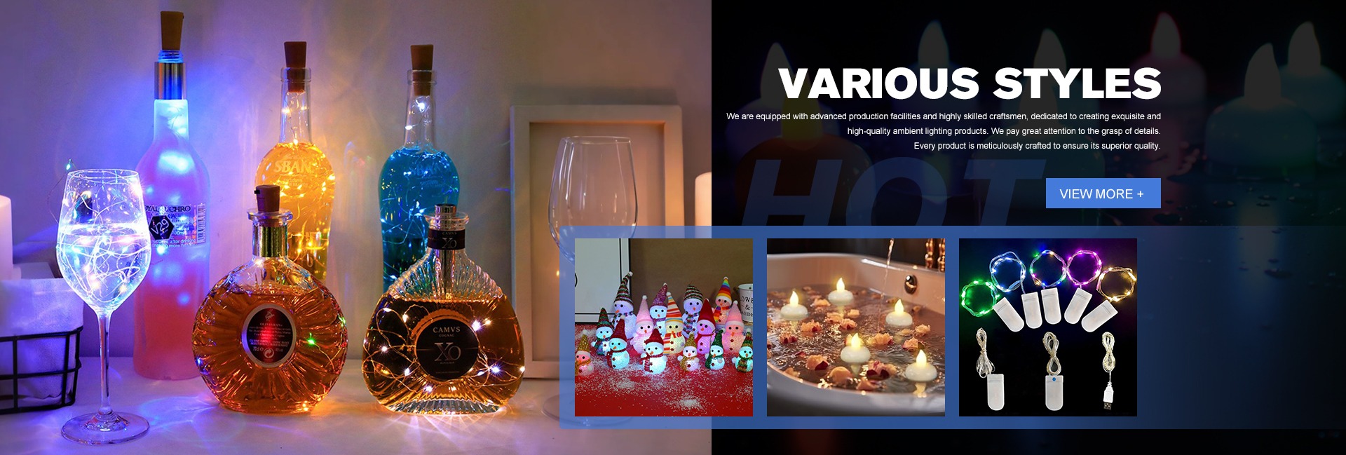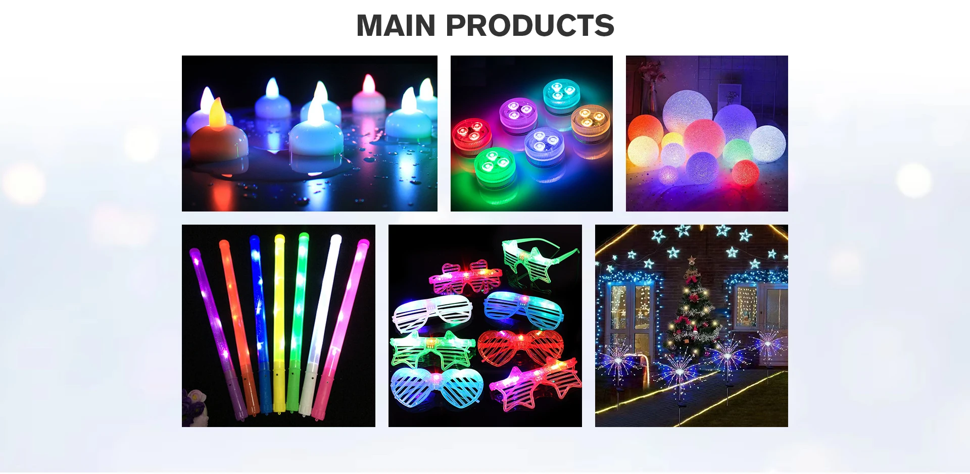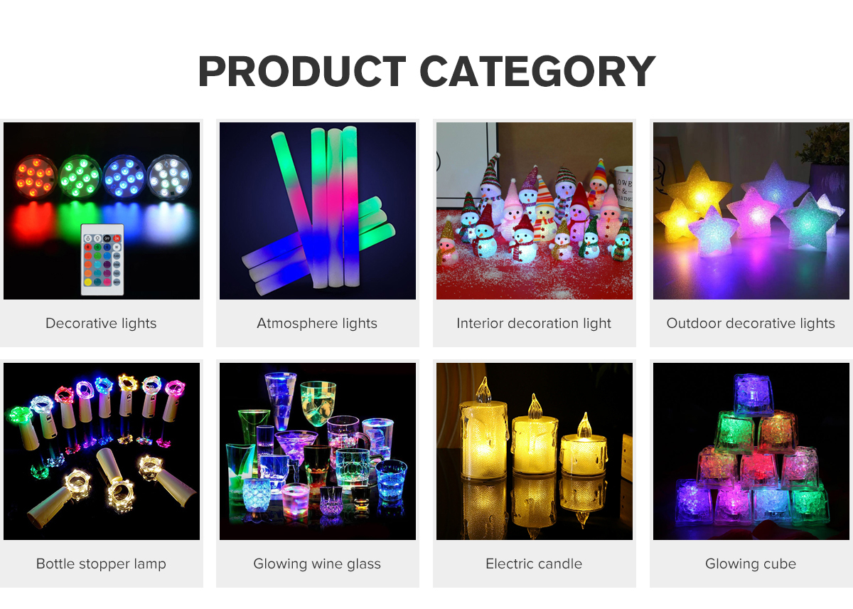 Productos principales:Cubo de hielo luminoso, luces de Navidad, cadena de luces LED, copa de vino luminosa, vela electrónica